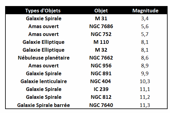 triés par magnitude, Avec un instrument d’initiation, M31, M32 et M110 sont accessibles,