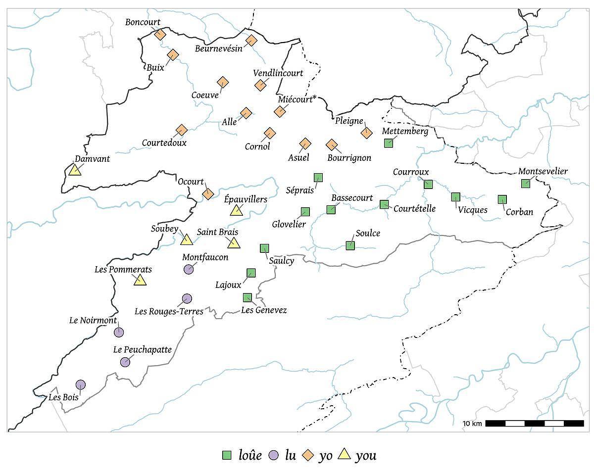 Car s’il existe bien un continuum linguistique sur le territoire, les mots peuvent prendre des formes différentes selon la région, voire entre villages voisins, trahissant rapidement l’origine du locuteur. Par exemple, la façon de dire « eux /elles » dessine les principales régions du canton : yo en Ajoie, you dans les côtes du Doubs, lu dans les Franches-Montagnes et loûe dans la Vallée de Delémont.