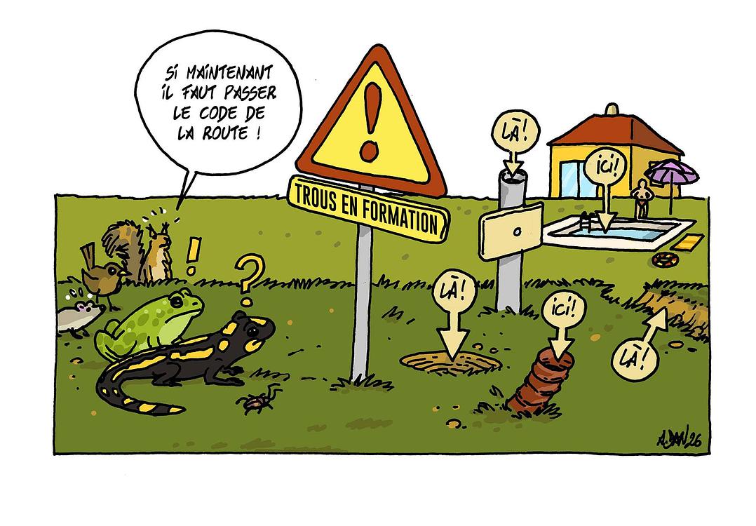 Ce sont des pièges du style « fosses à mammouths » : une fois tombés dedans, les animaux ne parviennent plus à s’en extraire. Ces trous peuvent être de toute origine et de toute taille : piscines vides, gaines dépassant verticalement du sol, trous apparus après avoir retiré un simple piquet… Les personnes qui relèvent les compteurs d’eau dans des fosses ouvertes rencontrent quantité de salamandres ou de tritons. « Je protège la nature, je ne les touche pas », disent-elles sans se douter que ces animaux sont en détresse et qu’il convient de les secourir. Chacun doit s’attacher à combler les trous inutiles, bloquer leur accès, ou aménager une échappatoire.