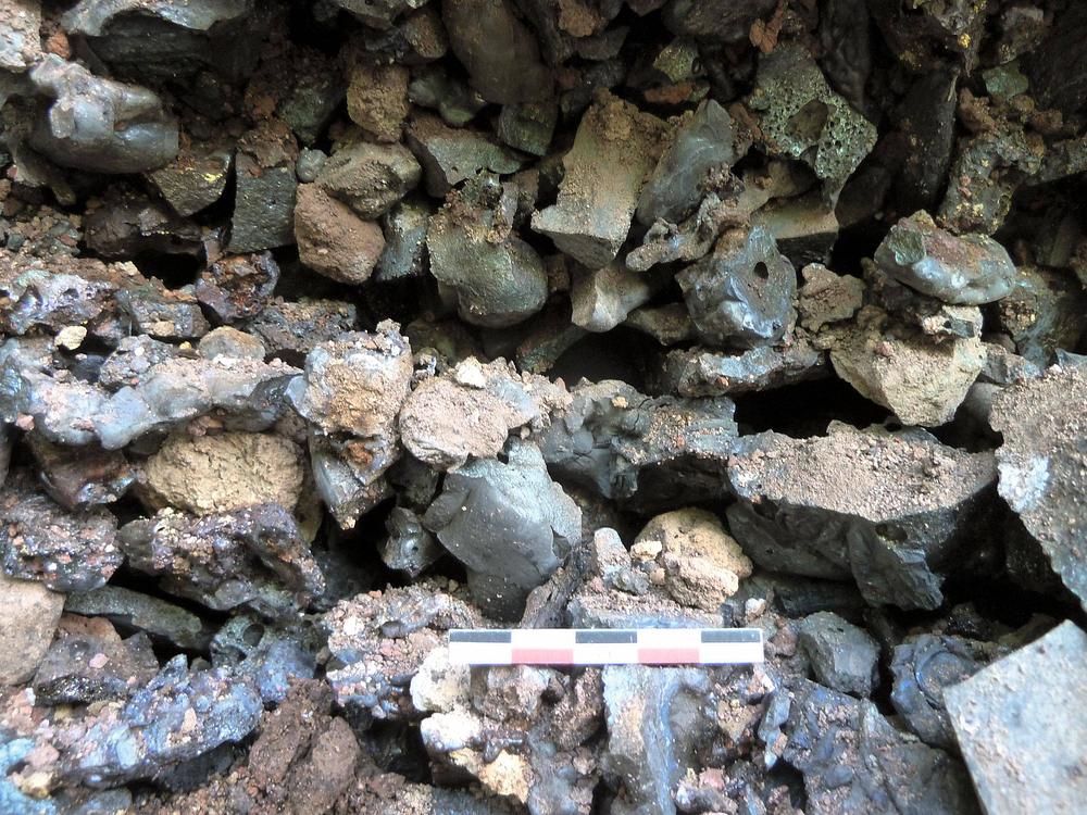 Photo début d'article : Zoom photographique sur une unité stratigraphique d’un ferrier datant du Ier s. ap. J.-C. et contenant de nombreux fragments de scories scellés par des résidus de minerai. Photo Marion Berranger