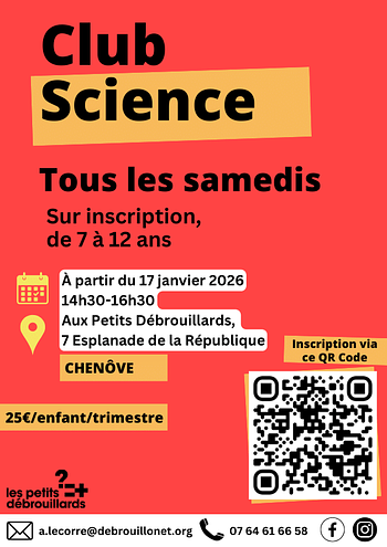 Un Club Science, c'est des activités scientifiques amusantes sur plein de sujets. Défis scientifiques, expériences et jeux vous attendent chaque semaine. Au fur et à mesure du Club, les enfants choisiront les thématiques qu’ils veulent aborder pour aboutir à un après-midi de valorisation le 4 avril où toute la famille est invitée. Selon le sujet, nous pourrons faire une sortie, une mise en scène ou une exposcience.
